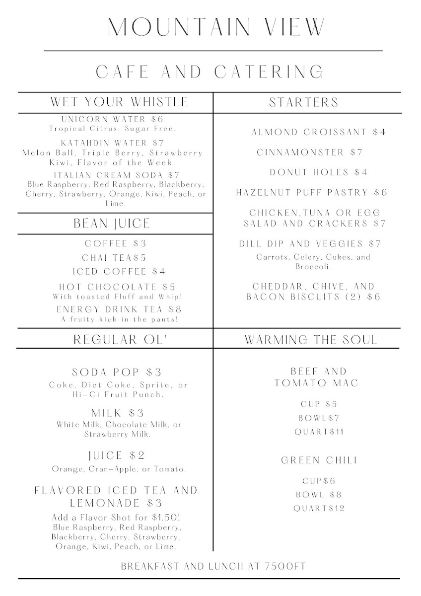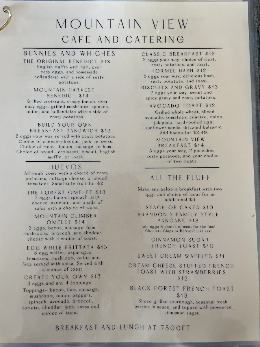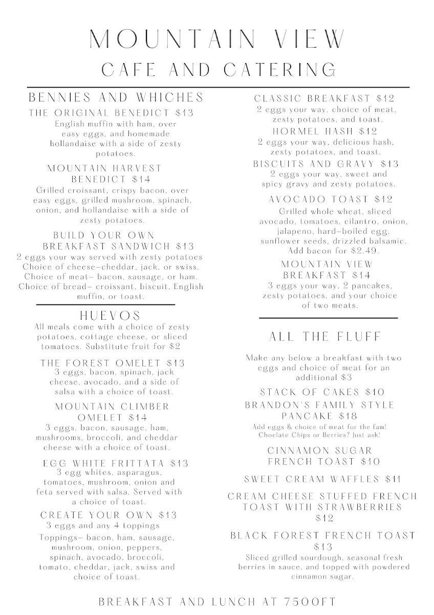 Welcome to Mountain View Cafe and Catering, a hidden gem nestled at 11424 Black Forest Rd in Colorado Springs, CO. With a menu that emphasizes simplicity and quality, this cozy cafe offers delightful dishes that celebrate fresh ingredients and satisfying flavors.